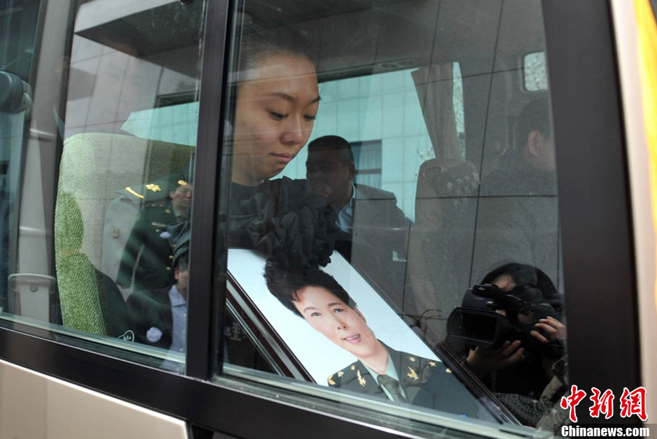 4月5日上午10点,排球名将陈招娣的遗体告别仪式在北京八宝山东礼堂举行。图为陈招娣女儿手捧遗像送别。中新网记者 金硕 摄