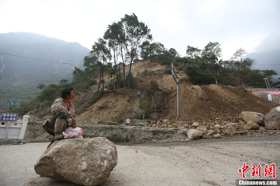 雅安7级地震造成宝兴县城的烈士陵园出现塌方,一名灾民正蹲在石头上等待救援。许云峰 摄