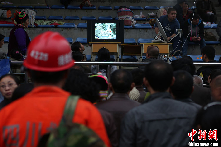 21日晚7时许,宝兴县中学灾民安置点内,灾民们正在观看央视《新闻联播》有关雅安地震的报道。许云峰 摄