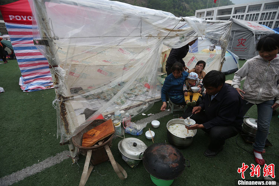 21日傍晚,在宝兴县灾民安置点内,一户人家住在用足球球门改造的帐篷里。许云峰 摄