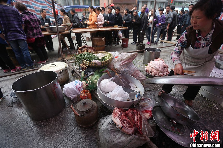 21日傍晚,宝兴县城红军广场的居民安置点,志愿者正在烹饪灾民们的饭菜,他们每天为近3000人提供食物。许云峰 摄