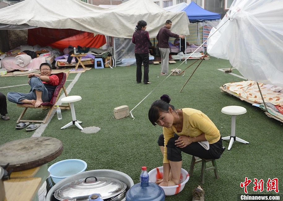 4月21日,四川省雅安市宝兴县灵关镇,灵关中学内的避难灾民在泡脚。廖攀 摄