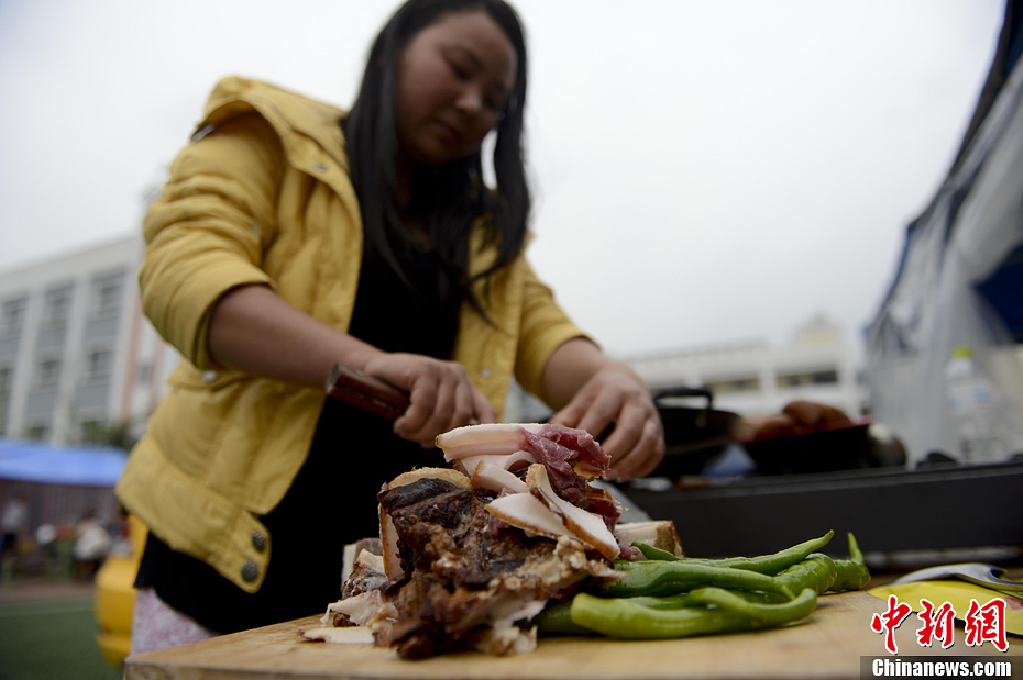 4月21日,四川省雅安市宝兴县灵关镇,安置在灵关中学的居民动用自家老腊肉做饭。廖攀 摄