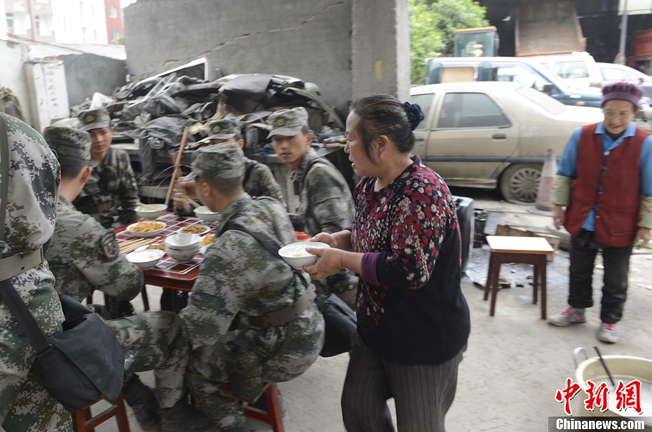 4月21日,四川省雅安市宝兴县灵关镇,该镇居民在自家为前来救灾的官兵做饭。廖攀 摄