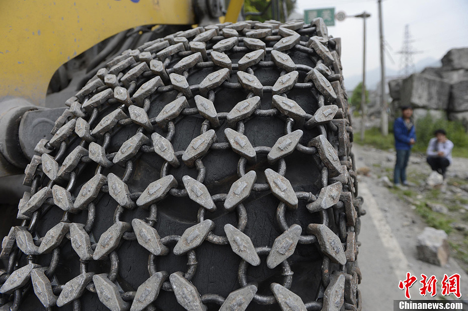 4月21日,四川省雅安市宝兴县灵关镇施工车辆轮胎穿上了铁链。廖攀 摄