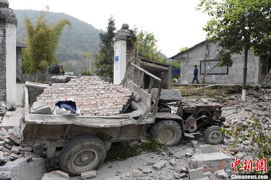 4月21日,四川省雅安市宝兴县灵关镇,受损的建筑和拖拉机。廖攀 摄