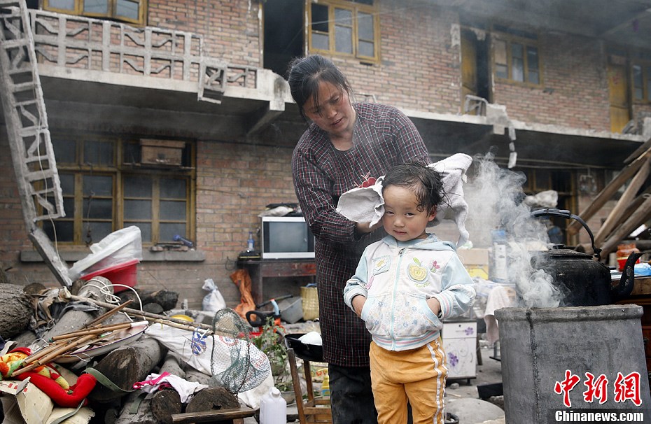 4月21日,四川雅安地震重灾区芦山龙门乡隆兴村,在得到足够水后,一位小朋友在震后得以第一次洗头。中新社发 张浩 摄