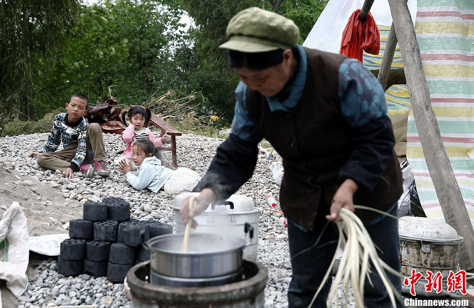 4月21日,四川雅安地震重灾区芦山龙门乡,三位留守儿童在震后住进了简易棚中,他们的老奶奶则在为他们做饭。在雅安遭受地震灾害的许多村子里,许多父母都外出打工,留下了年迈的长辈和幼小的孩子。中新社发 张浩 摄