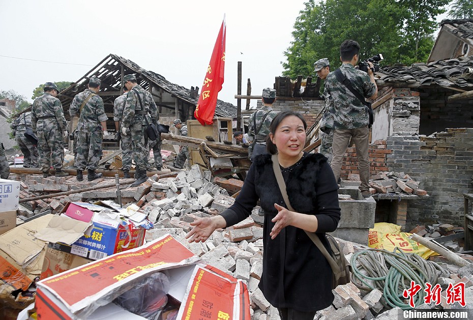 4月21日,四川雅安地震重灾区芦山龙门乡,一名百货店的老板正在讲述她震后的经历,而她身后的官兵们正在帮她搜出散落的百货。中新社发 张浩 摄