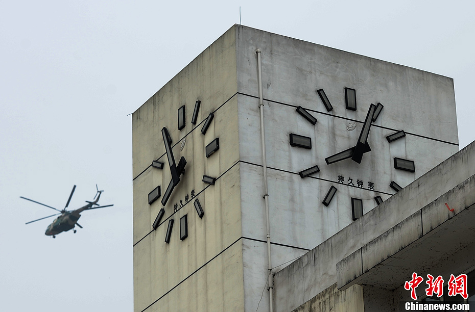 4月21日,一救援直升飞机飞过四川雅安灾区上空。4月20日8时2分,四川省雅安市芦山县(北纬30.3,东经103.0)发生7.0级地震, 震源深度13公里。中新社发 陈超 摄