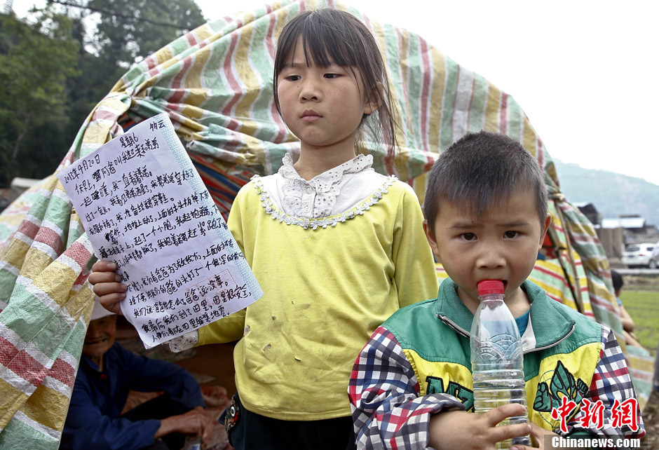 4月21日,四川雅安地震重灾区芦山龙门乡,在一个农田里的自制简易“抗震棚”外,9岁的姐姐高梦思正在展示她在20日地震时救出身旁弟弟后写的日记。中新社发 张浩 摄