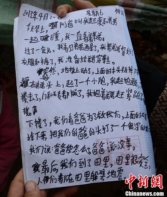 4月21日,图为高梦思记录当天事情经过的日记。4月20日,芦山县龙门乡,地震发生时9岁的高梦思在和4岁的弟弟在家,一块木板砸在弟弟的头上,高梦思一把抱起弟弟到了安全的地方,检查后弟弟只是受了些轻伤。中新社发 张元 摄