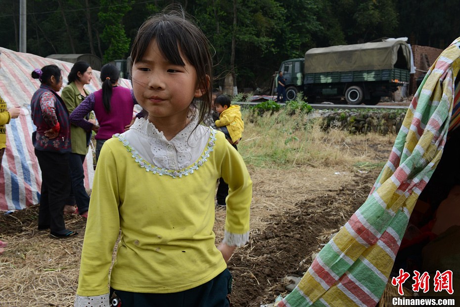 4月21日,住在简易帐篷里的高梦思。4月20日,芦山县龙门乡,地震发生时9岁的高梦思在和4岁的弟弟在家,一块木板砸在弟弟的头上,高梦思一把抱起弟弟到了安全的地方,检查后弟弟只是受了些轻伤。中新社发 张元 摄