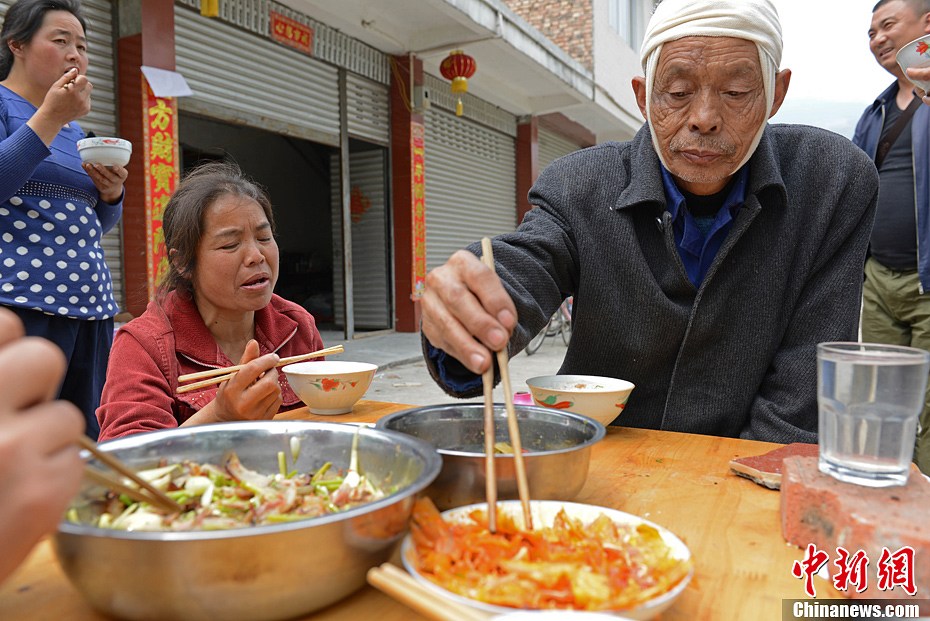 4月21日下午2点,芦山县龙门乡75岁的村民傅玉润(右一),地震以来第一次吃上了大米饭。从4月20日地震发生时傅玉润被掉落的砖块砸伤头部,现已无大碍。中新社发 张元 摄