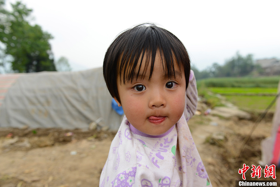 4月21日,四川雅安芦山县龙门乡一位在简易帐篷外玩耍的小孩。中新社发 张元 摄