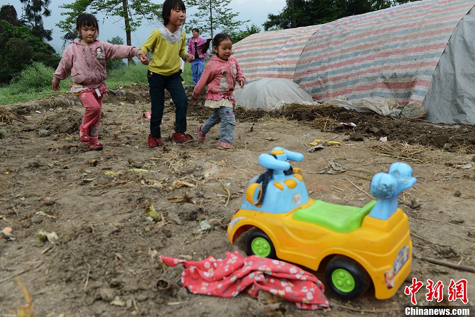 4月21日,四川雅安芦山县龙门乡三个小孩在一辆玩具车前走过。中新社发 张元 摄