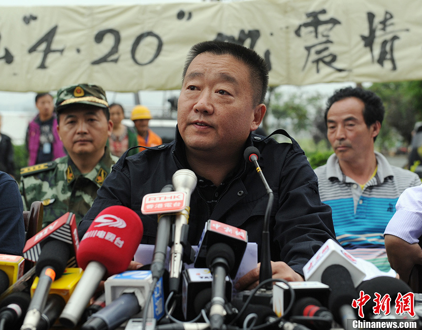 4月21日下午,四川雅安市在芦山震灾区召开抗震救灾通报会,通报会上集体向“4.20”地震遇难同胞默哀,期间还两次发生余震。截至21日地震已导致当地168人遇难,24人失踪,10871人受伤。已发生余震1606次,最大余震5.4级。图为雅安市政府副市长廖磊通报震情。中新社发 刘忠俊 摄