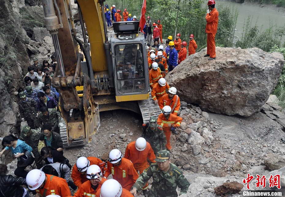 4月21日,四川眉山消防首批34名救援官兵采取间断徒步行军和搭乘沿途车辆向宝兴挺进,经约3小时行进20余公里,抵达宝兴县城。行进途中救援队为被飞石砸坏的银白色面包车中抢救出贵重物品。并护送记者和返乡民众70余人安全抵达宝兴。救援队抵达震灾区宝兴县城后迅速展开救援等工作。图为消防官兵徒步前往震灾区宝兴。中新社发 李洋 摄