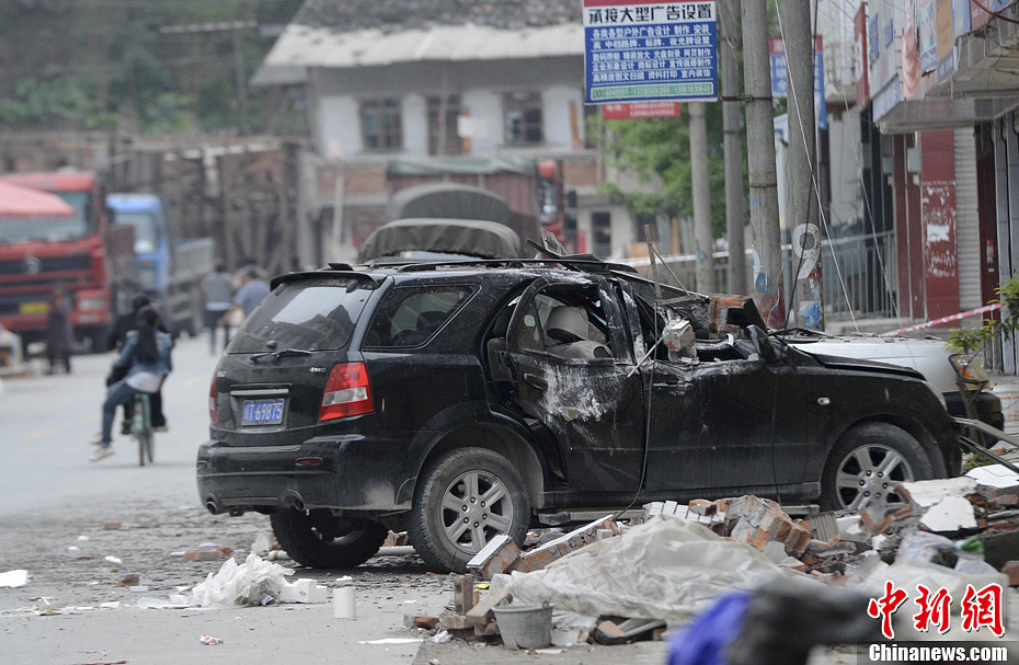 4月21日,四川省雅安市宝兴县灵关镇,街头的受损车辆。中新社发 廖攀 摄