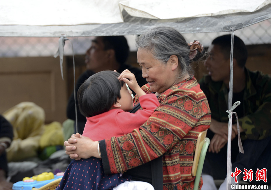 4月21日,四川省雅安市宝兴县灵关灾民安置点的老妇和孩童。中新社发 廖攀 摄