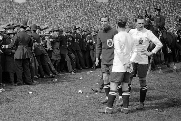 2.1923年——温布利球场迎来开放后的首场比赛,也是在这里举行的收场足总杯比赛,最终博尔顿以2-0击败西汉姆夺冠。这场比赛的观众人数达到创纪录的12万6047人,不过这只是官方数字,实际涌入温布利球场的观众人数预计在20万。负责维持秩序的警察奋力清理球场上的球迷,为此,比赛被推迟了45分钟。图片来源:环球网