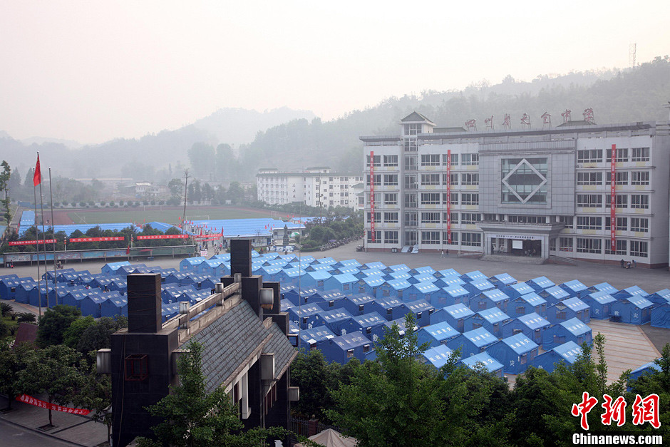 4月27日上午,供四川雅安天全县中学高中一、二年级1400多名学生上课的“板房教室”和12间办公室全部交付使用,总面积达2300平米。“板房教室”建在天全中学操场,由中国电建集团援建。26日高二年级5个班搬进了“板房教室”。27日全部交付投入使用。“板房教室”达到防震、防火、防风、防雨、防寒要求。图为学生们往“板房教室”搬书本。中新社发 张占国 摄