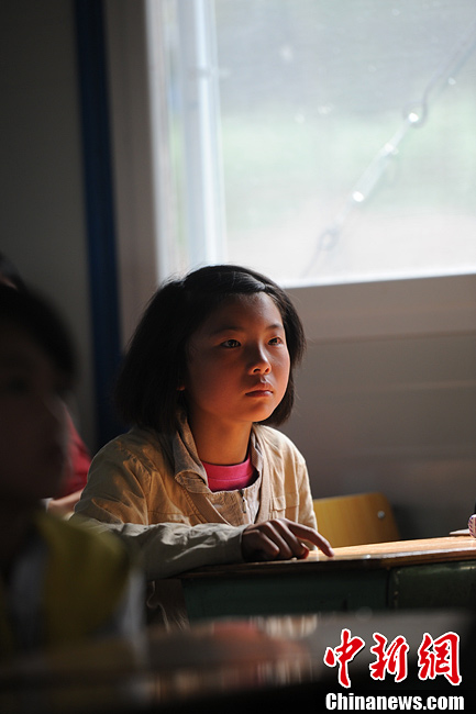 4月27日,芦山县天气晴朗,阳光洒进乐山军分区援建的隆兴板房学校教室里,孩子们正在上心理课。中新社发 张浪 摄