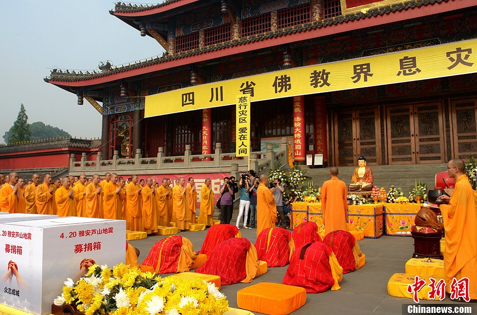 4月27日,四川佛教界为芦山震灾区举行祈福法会和募捐活动,四川佛教协会会长释永寿带领众高僧诵经祈祷,超度在地震中遇难的同胞,祝愿灾区民众早日度过难关,重建美好家园。随后,永寿大和尚等佛教界高僧及数百爱心人士还向灾区民众捐款。图为祈福法会现场。中新社发 刘忠俊 组稿