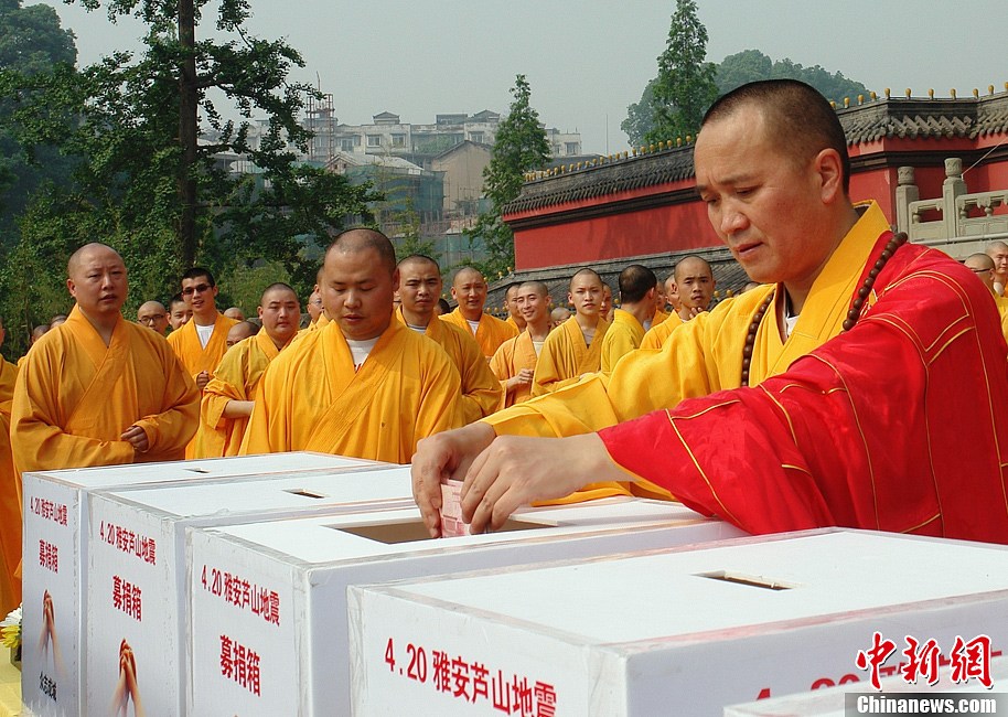 4月27日,四川佛教界为芦山震灾区举行祈福法会和募捐活动,四川佛教协会会长释永寿带领众高僧诵经祈祷,超度在地震中遇难的同胞,祝愿灾区民众早日度过难关,重建美好家园。随后,永寿大和尚等佛教界高僧及数百爱心人士还向灾区民众捐款。图为四川佛教协会会长释永寿向震灾区民众捐款。中新社发 刘忠俊 组稿