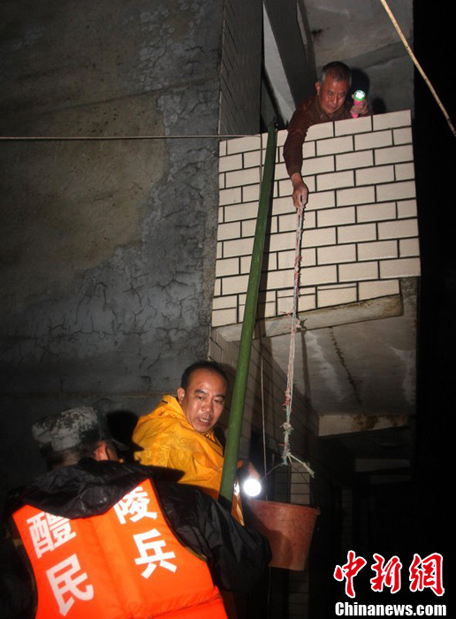 5月15日,湖南省醴陵市人民武装部官兵给泗汾镇何家垅村下大组村民送来食物和物资。何勇 摄 图片来源:CFP视觉中国