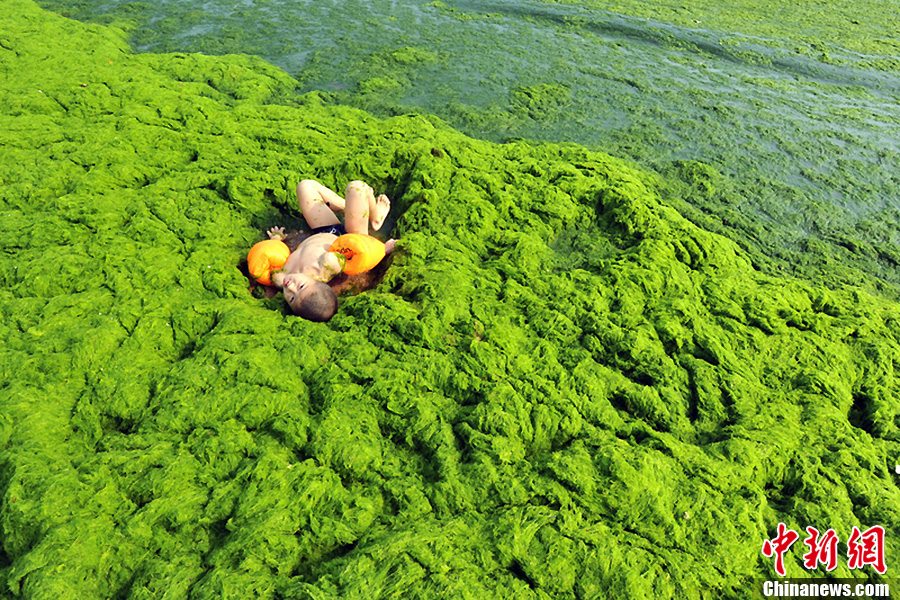 到海上看草原 青岛沿海今年最大浒苔群凶猛来袭