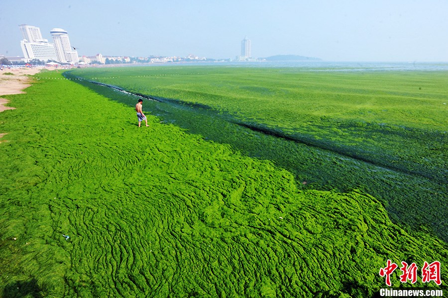 到海上看草原 青岛沿海今年最大浒苔群凶猛来袭