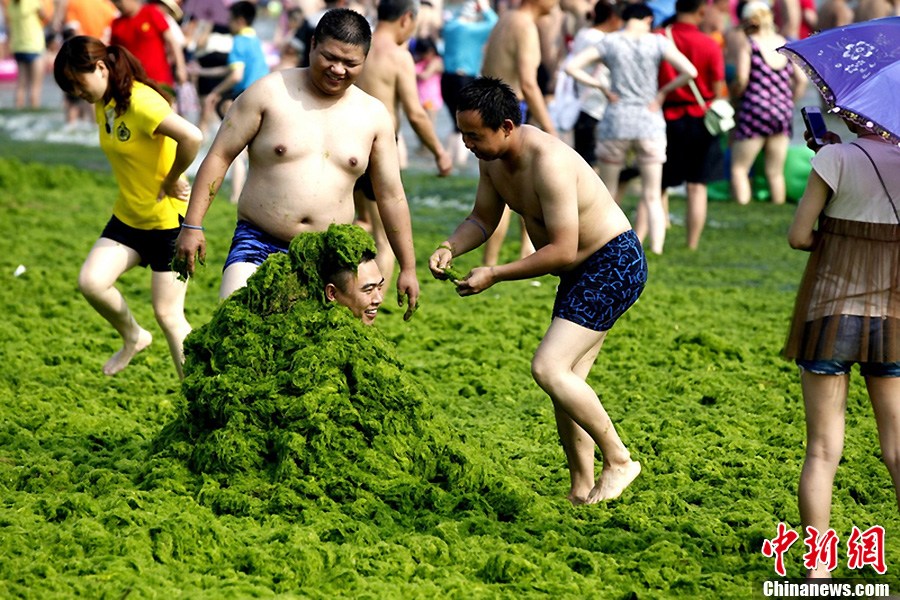 最凶浒苔群侵袭青岛 民众畅享“浒苔浴”
