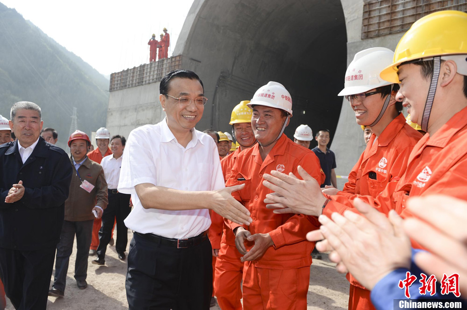 8月18日,国务院总理李克强考察兰渝铁路木寨岭隧道工地。他对工人们说:“铁路对西部发展有重要意义。在西部山区修铁路非常艰苦,但你们是用艰辛和努力为西部贫困人口打开致富大门。一定要既保证工程质量,又保证自身安全。”廖攀 摄
