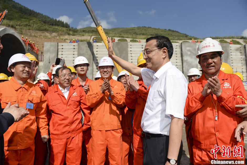8月18日,国务院总理李克强考察兰渝铁路木寨岭隧道工地。他对工人们说:“铁路对西部发展有重要意义。在西部山区修铁路非常艰苦,但你们是用艰辛和努力为西部贫困人口打开致富大门。一定要既保证工程质量,又保证自身安全。”廖攀 摄