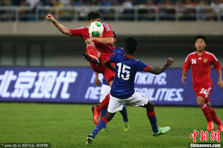 9月10日,2013国际足球热身赛,中国男足主场迎战马来西亚,凭借郑龙和杨旭的进球。国足最终以2:0完胜马来西亚队,取得热身赛两连胜。图为赵旭日抢球。图片来源:CFP视觉中国