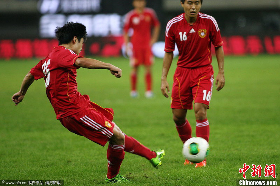 9月10日,2013国际足球热身赛,中国男足主场迎战马来西亚,凭借郑龙和杨旭的进球。国足最终以2:0完胜马来西亚队,取得热身赛两连胜。图为郑龙任意球破门。图片来源:CFP视觉中国
