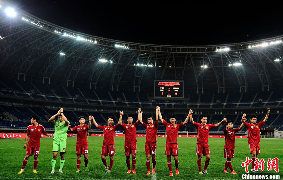 9月10日晚,天津奥林匹克中心体育场,中国国家队以2比0击败马来西亚队取得热身赛连胜。中新社发 佟郁 摄