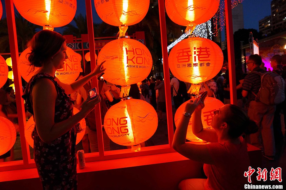 9月19日,中秋夜,香港维园中秋彩灯会上人山人海,大批市民及访港游客穿梭在璀璨的灯饰中,感受节日欢欣。图为外国游客兴致勃勃在大红灯笼前留影。中新社发 洪少葵 摄