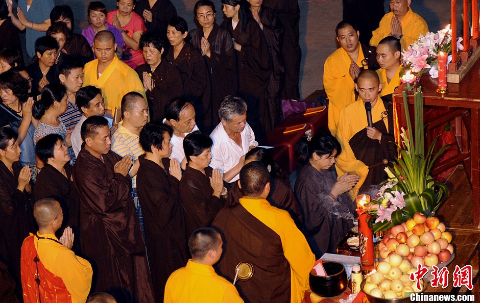 9月19日晚,中秋夜,千年古刹——福州开元寺举行礼拜月光菩萨法会。参加该法会的信众祈福国泰民安、风调雨顺。中新社发 刘可耕 摄