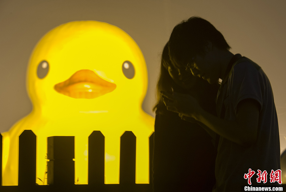 9月19日中秋之夜,一对情侣在北京园博园内的“大黄鸭”前拍照留念。中新社发 侯宇 摄