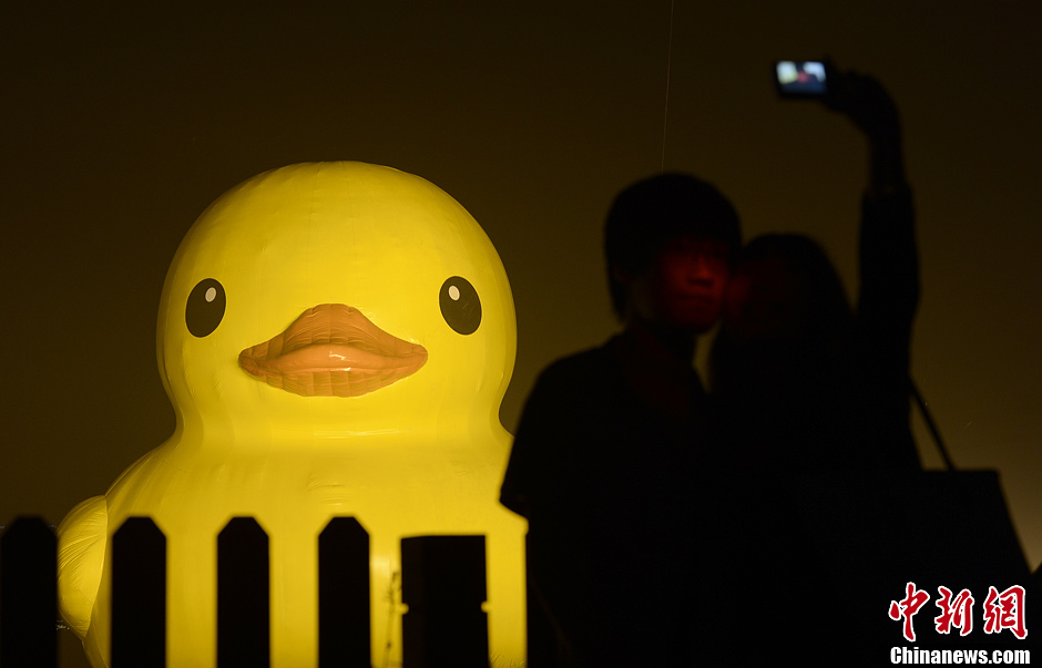 9月19日中秋之夜,一对情侣在北京园博园内的“大黄鸭”前拍照留念。中新社发 侯宇 摄