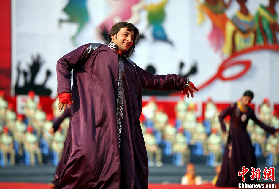 9月19日,是中国传统的中秋节,来自五大洲14个国家的300多位艺术家们,在三峡工程所在地湖北宜昌市和当地观众一起欢度中秋,激情大联欢。活动中,激情澎湃的俄罗斯歌曲《我可爱的母亲俄罗斯》、张扬个性的美国舞蹈《嬉皮士》、狂热豪放的非洲舞蹈《路》、深受年轻人喜爱的澳大利亚摇滚《最炫民族风》以及彰显埃及传统的舞蹈《转裙舞》等一个个极具艺术性和欣赏性的节目登台展出,把整个活动推向高潮。中国艺术家和宜昌本土艺术家也激情飞扬,把绚烂民族风绽放在这个舞台上。中国国际民间文化艺术节由中国文联主办,已成功举办了八届,五大洲70多个国家、100多个民族民间歌舞团曾参加这一盛会。图为巴基斯坦民歌舞团的《塔克西拉》。刘良伟 摄