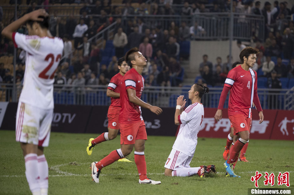 10月8日,天津东亚运男足第二轮比赛,中国队与中国香港队在90分钟里均无建树,最终以0-0的比分结束全场比赛。图为中国队徐新攻门偏出后失落跪地。中新社发 崔楠 摄