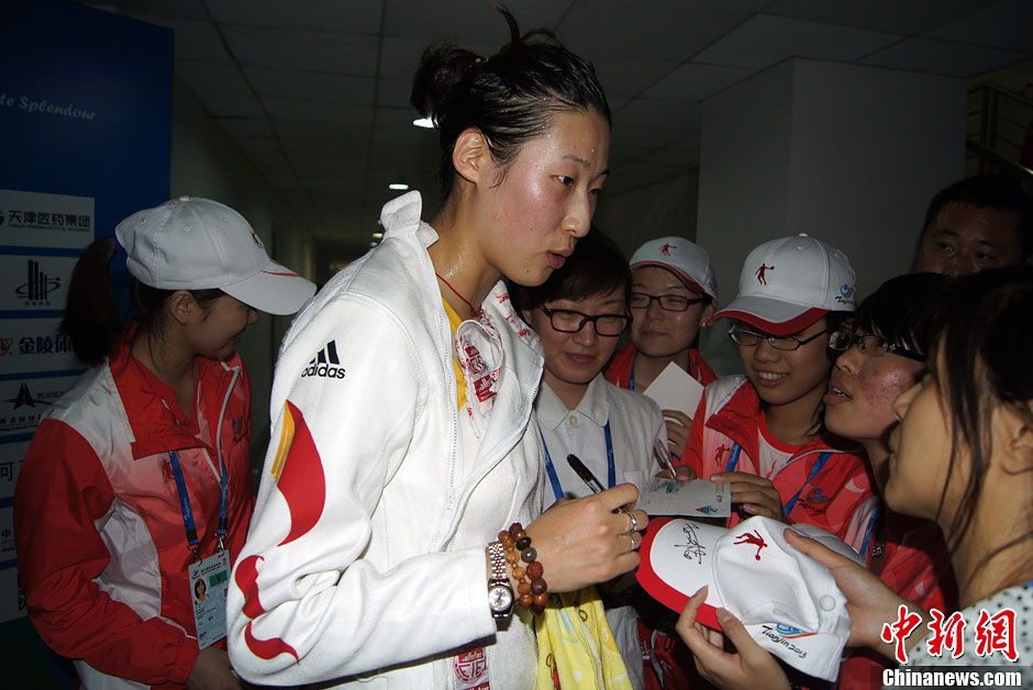 10月9日,2013年东亚运动会击剑项目在天津外国语学院进行,在女子个人重剑比赛中,孙玉洁战胜韩国选手夺冠。图为孙玉洁赛后被粉丝求签名。中新社发 张道正 摄