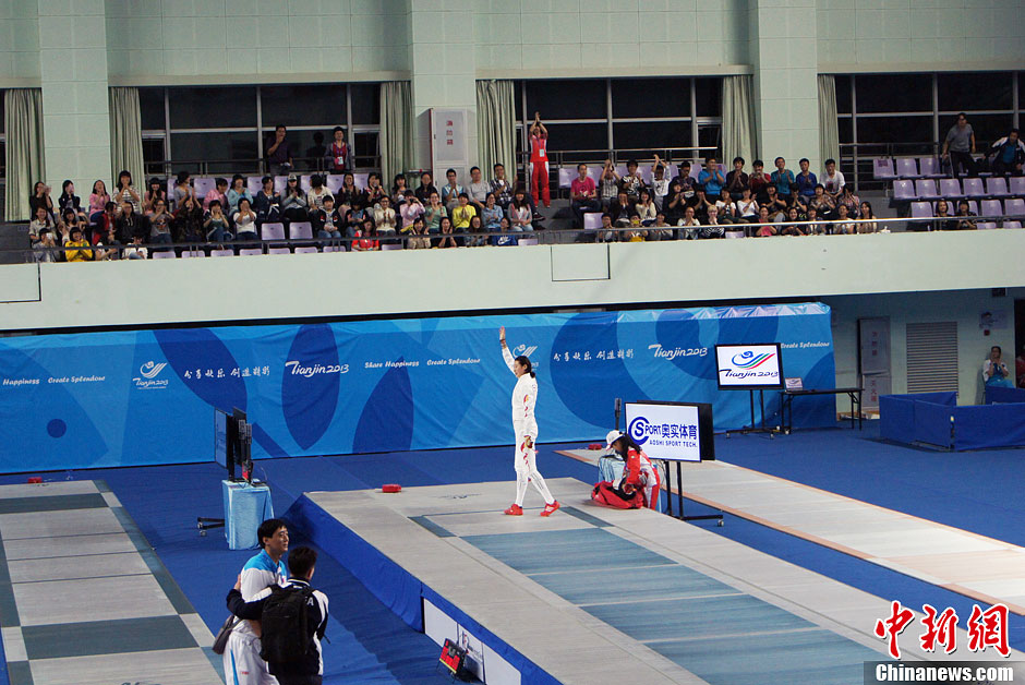 10月9日,2013年东亚运动会击剑项目在天津外国语学院进行,在女子个人重剑比赛中,孙玉洁战胜韩国选手夺冠。中新社发 张道正 摄