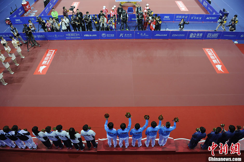 10月9日,天津东亚运女乒团体决赛中,中国队以3-0的总比分战胜日本队,为中国队再添一金。图为颁奖典礼。中新社发 崔楠 摄
