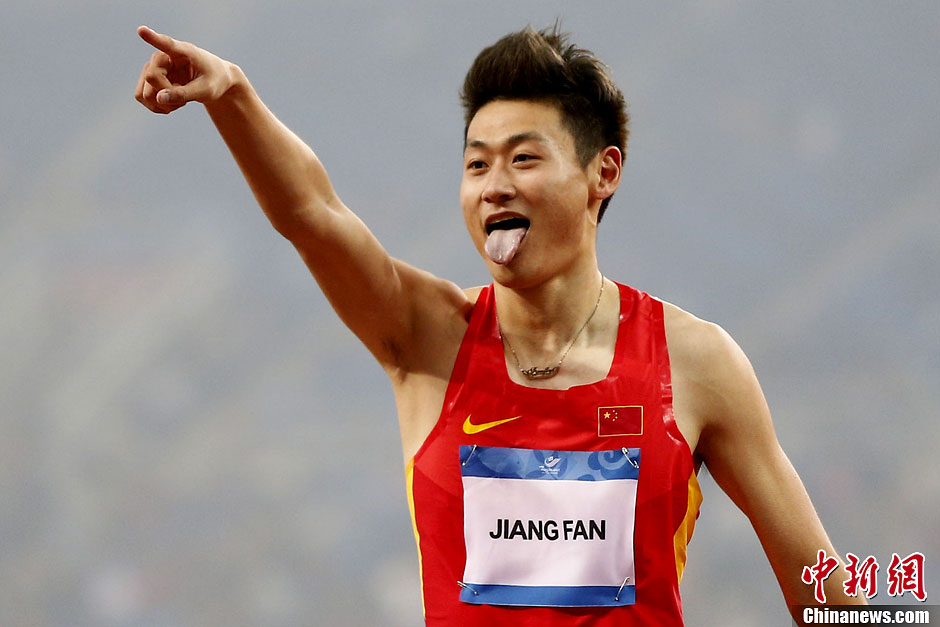 10月9日,在2013东亚运动会田径男子110米栏决赛中,中国选手江帆(图)以13.58秒摘得金牌。中新社发 富田 摄
