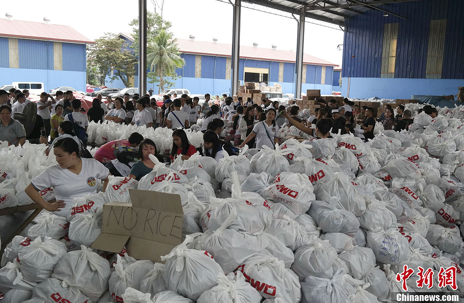 11月12日,菲律宾许多民众自发赶到菲律宾社会福利部设在首都大马尼拉地区的国家物资管理中心(NROC),帮助分装、搬运即将运往台风灾区的救灾物品。图为志愿者分装好的物资堆积如山。超强台风“海燕”日前在菲律宾中部登陆,造成多个省份灾情严重,菲律宾总统阿基诺11日晚间宣布全国进入“灾难状态”,菲律宾政府与民众正全力展开救援和赈灾活动。中新社发 张明 摄