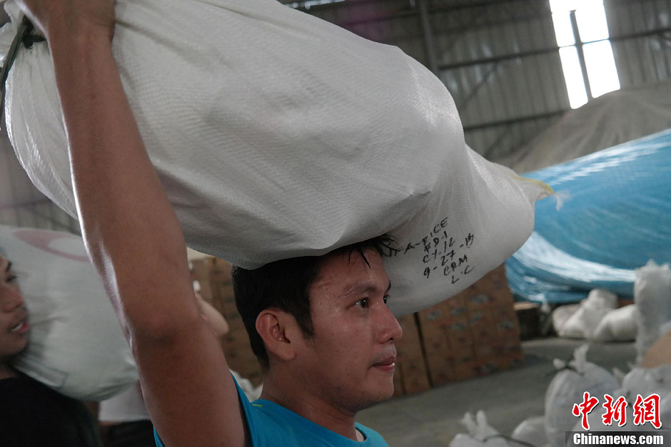 11月12日,菲律宾许多民众自发赶到菲律宾社会福利部设在首都大马尼拉地区的国家物资管理中心(NROC),帮助分装、搬运即将运往台风灾区的救灾物品。图为一名志愿者帮助搬运物资。超强台风“海燕”日前在菲律宾中部登陆,造成多个省份灾情严重,菲律宾总统阿基诺11日晚间宣布全国进入“灾难状态”,菲律宾政府与民众正全力展开救援和赈灾活动。中新社发 张明 摄